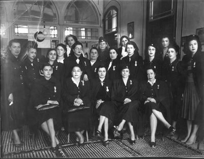 صورة صوفيا (الثانية من اليمين) في صورة تذكارية بمناسبة تأسيس الفرع النسائي عام 1948 بحضور السيدة زهرة اليوسف زوجه رئيس الجمهورية محمد علي العابد